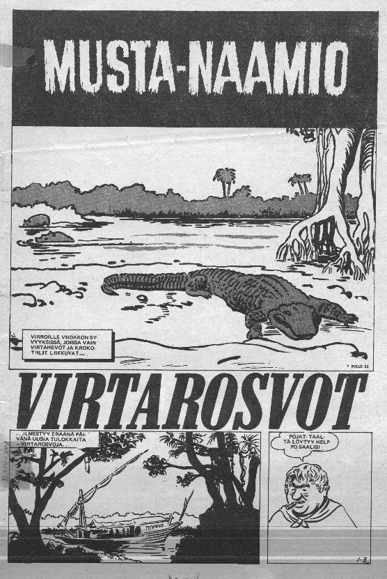 Mustanaamio 1 1968Sivu 1Mustanaamio: VirtarosvotKäsikirjoitus: Lee FalkKuvitus: Wilson McCoy23,5 sivuaAlkuperä: The River GangSunday Strips: (N:o 54) 10.1.1960 - 22.5.1960