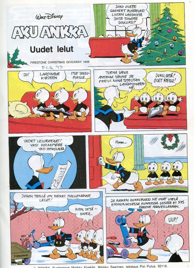 Aku Ankan Jouluyllätys1989Walt Disneyn Klassikot 15sivu 3Uudet Lelut8 sivuaFirestone Christmas Giveaway (1949)New ToysPiirtäjä: Carl Barks