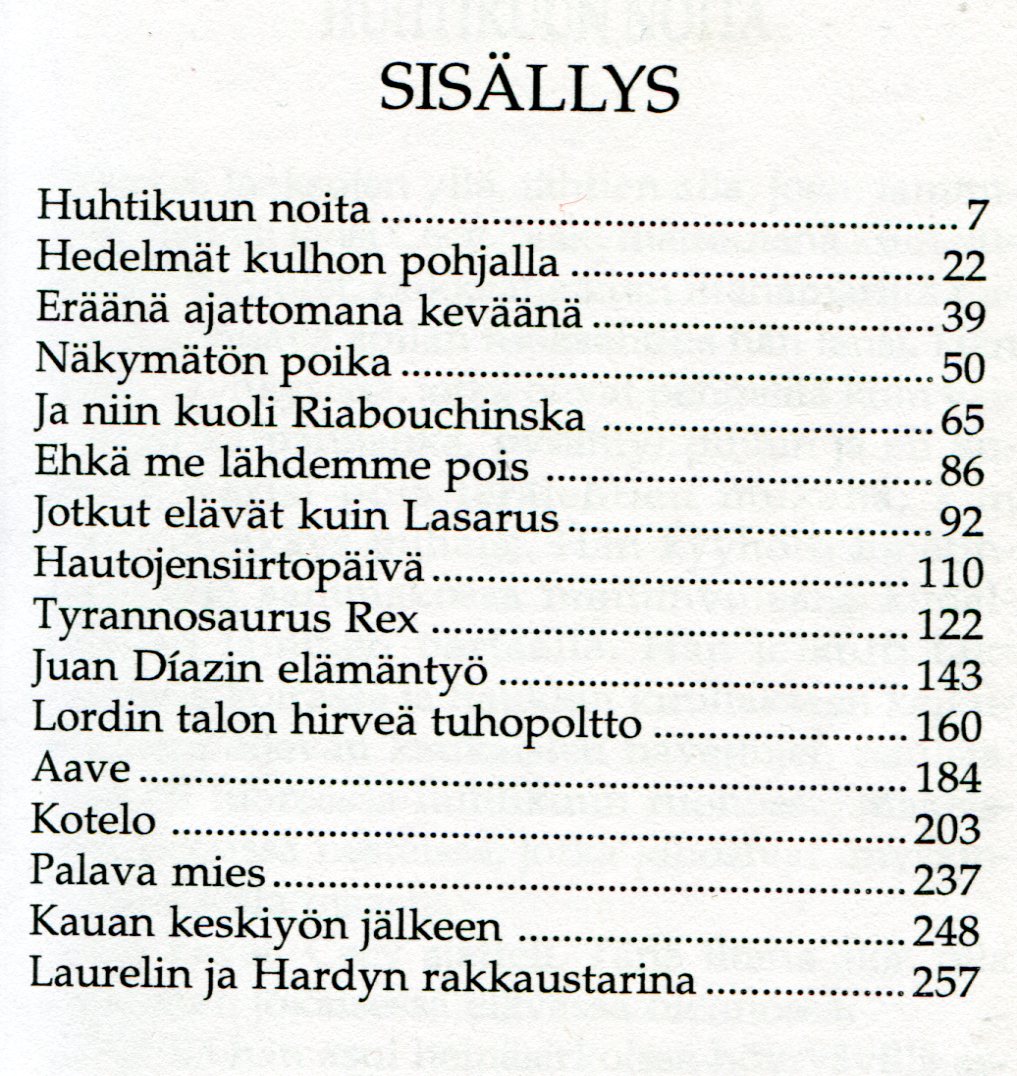 Huhtikuun Noita1998NovellikokoelmaKirjailija: Ray BradburyKansi: Hannu LipponenSuomentaja: Anita PuumalainenKustantaja: Portti-Kirjat