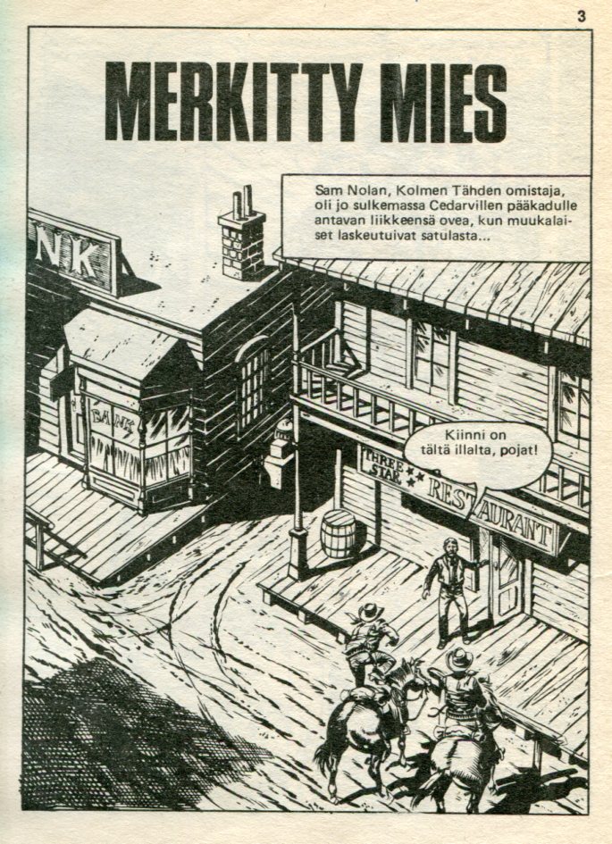 Lännen Korkeajännitys 111980sivu 3Kansi: VÄÄRÄ - TuntematonMerkitty MiesStarring: Rett Ryder (alunperin Buck Jones)Alkuperä:Cowboy Picture Library 370 (1960)The Wreckers at Comanche CanyonPiirtäjä: Franco BignottiAlkup kansi:Piirtäjä: Jordi Penalva