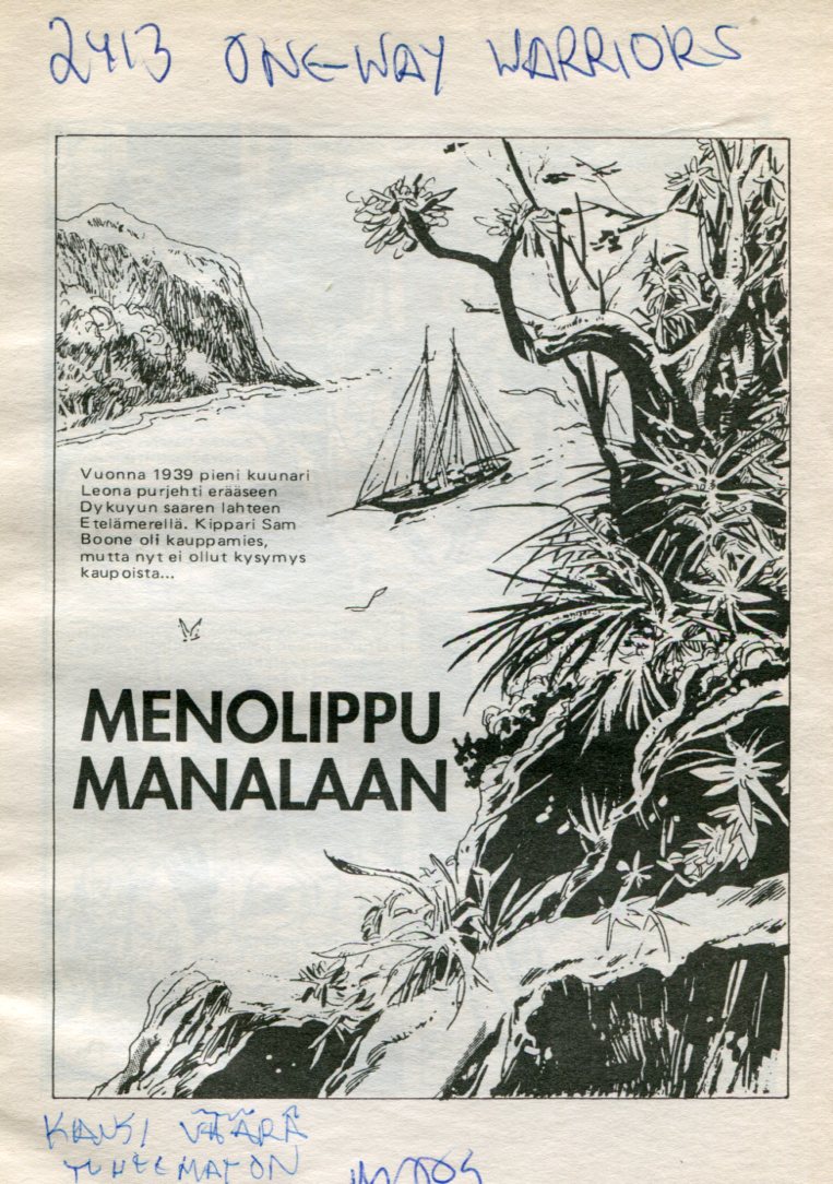 Menolippu Manalaan Alkuperä: Commando 2413 (1990) One-Way Warriors Piirtäjä: Olivera Teksti: C.G.Walker