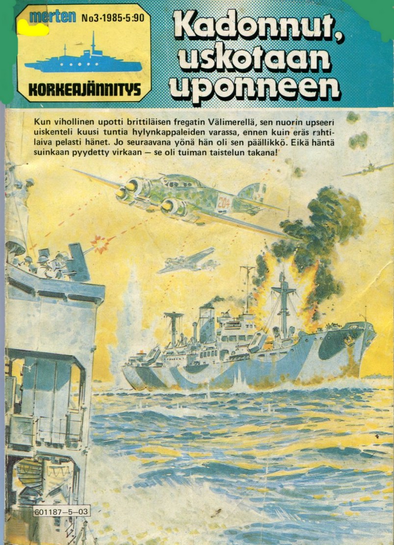 Merten Korkeajännitys 31985Kadonnut, Uskotaan UponneenKannen piirtäjä:Jeff BevanKadonnut, Uskotaan UponneenAlkuperä: Commando 1670 (1983)Missing, Believed SunkPiirtäjä: Gordon LivingstoneTeksti: R.A.Montague