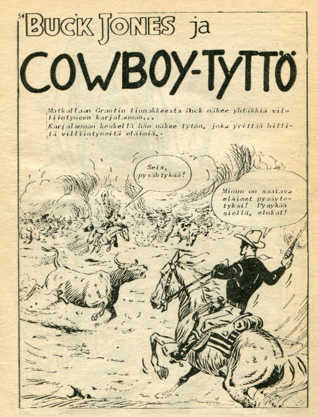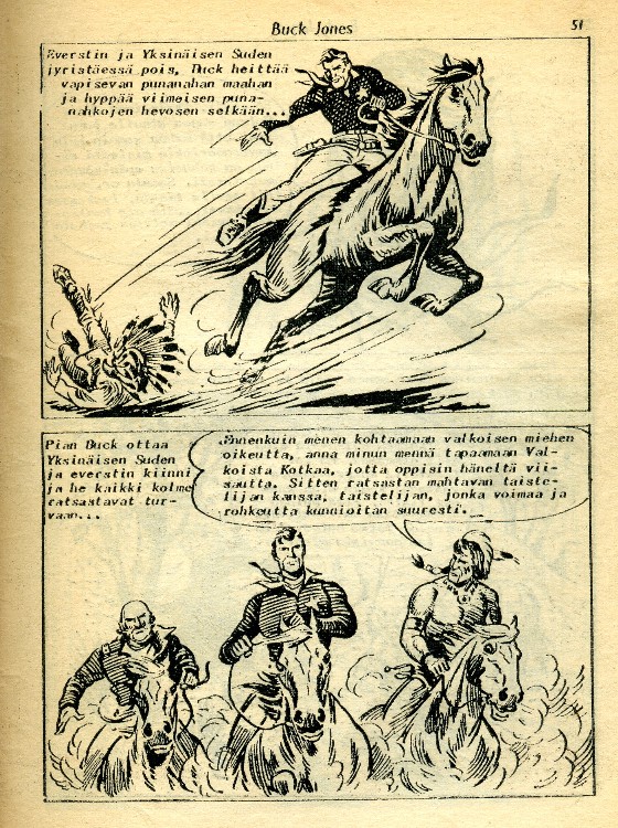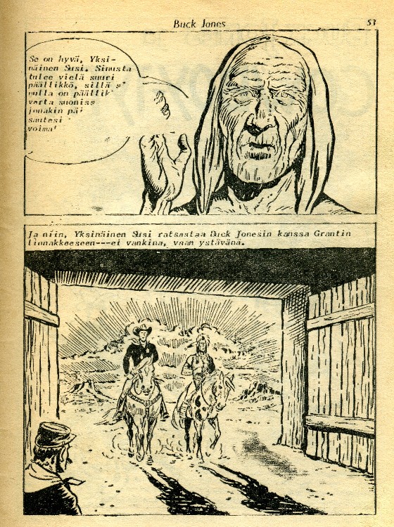 Buck Jones 5 1958 sivu 53Piirtäjä: R.Charles Roylance... ja niin Yksinäinen Susi ratsasti Buck Jonesin rinnalla Grantin Linnakkeeseen - ei vankina, vaan ystävänä.