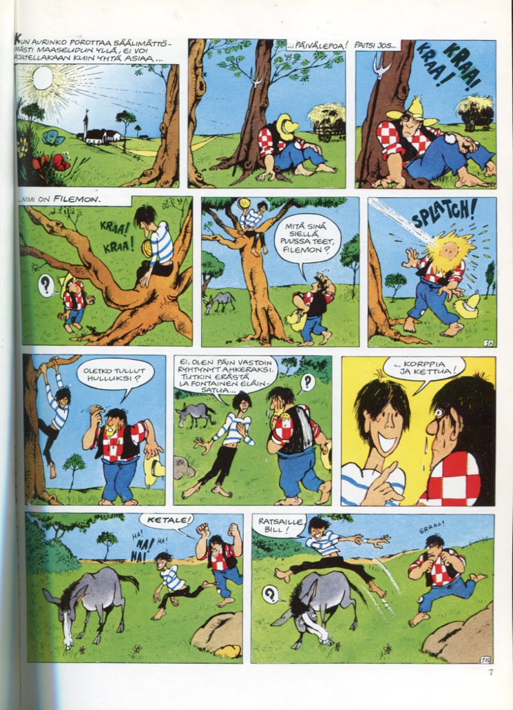 Filemon Kolmen Pöllön Aukean Arvoitus Le mystere de la clairiere des trois hibooux (1965) Piirtäjä: Fred Teksti: Fred