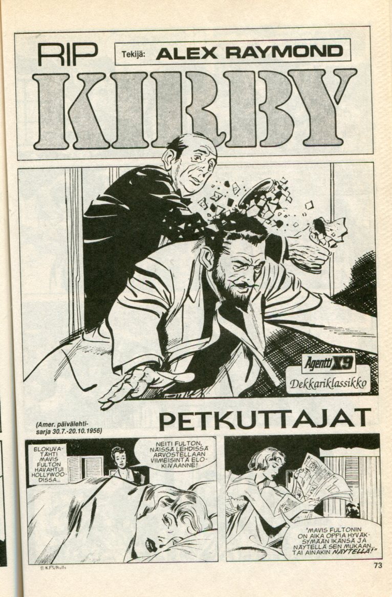 sivu 73 Rip Kirby Petkuttajat Elixir of Youth amer.päivälehtisarja 30.7.-20.10.1956 Piirtäjä 1: Alex Raymond (kuoli 6.9.1956) Piirtäjä 2: John Prentice Teksti 1: Alex Raymond Teksti 2: Fred Dickenson
