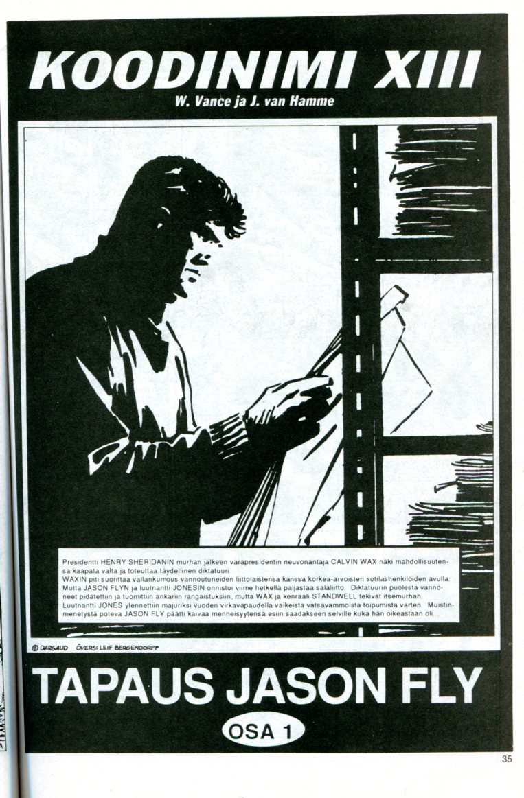 sivu 35 Koodinimi XIII (alkup: XIII perustuu löyhästi Ludlumin kirjaan Bourne Identity eli Medusan Verkko) Tapaus Jason Fly piirtäjä: William Vance teksti: J.van Hamme