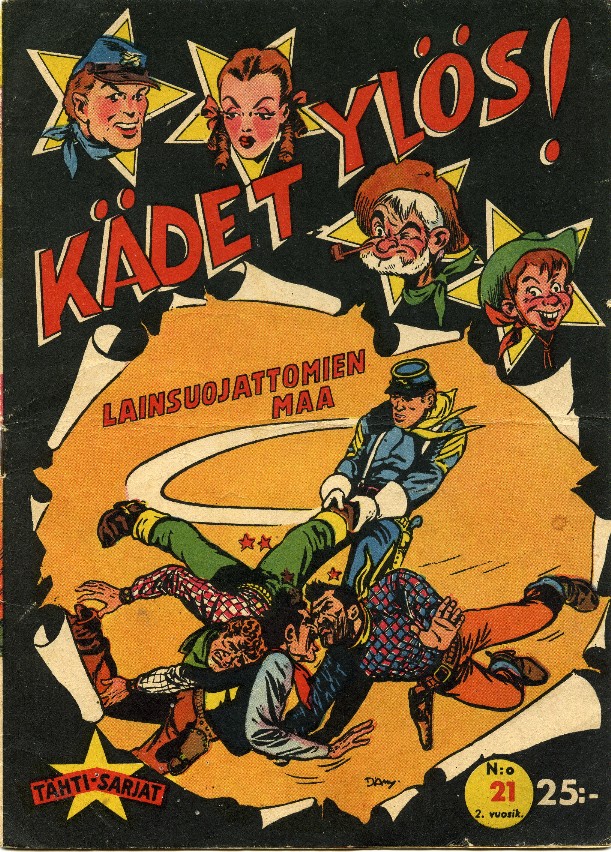 Kädet Ylös! 21 1954Kädet Ylös: Lainsuojattomien Maa (8 sivua)Piirtänyt: Roy D'AmyJorga - Viidakon Valtias (2 sivua)Teksti: G.L.BonelliPiirtänyt: Tony Chan