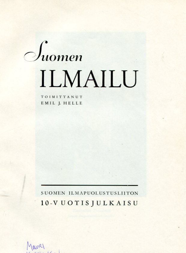 Suomen IlmapuolustusliitonKymmenvuotisjulkaisu 1925 - 19351936sivu 36Toimittanut: Emil J.HelleKoko: 20 cm x 26 cmSivuja: 360Julkaisija: Suomen Ilmapuolustusliitto