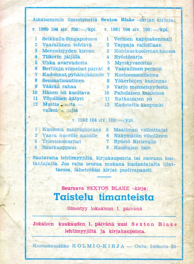 Sexton Blake 91962Henkipaton ErehdysMan on the RunKirjailija: Arthur KirbySuomentaja: Kustantaja: Kolmio-Kirja