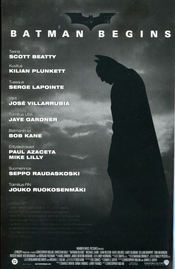 BatmanBatman Begins2005sivu 1ElokuvaspesiaaliPiirtäjä: Kilian PlunkettTeksti: Scott Beattysivuja: 64Kustantaja: Egmont