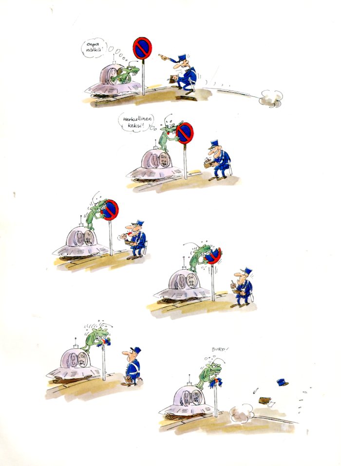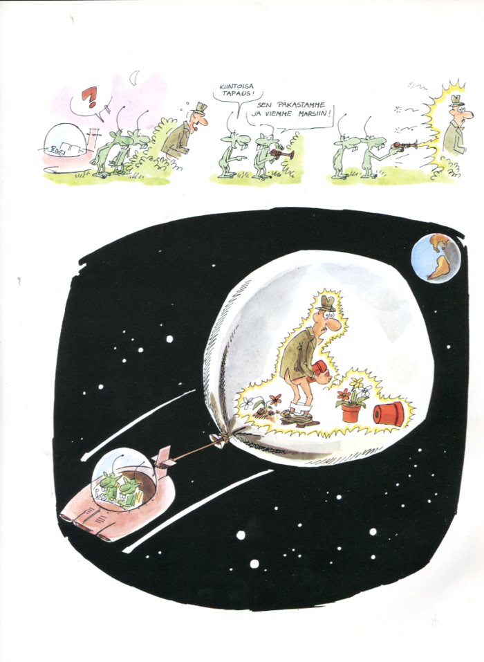 Pienet Vihreät Valloittajat1977Die Kleinen Grünen Männchen Sind Wieder Da!Tekijä: Pat MalletKovat KannetKoko: 23 cm x 30 cm4-Värisivuja: 60Kääntäjä: Renne NikupaavolaKustantaja: Weilin-Göös