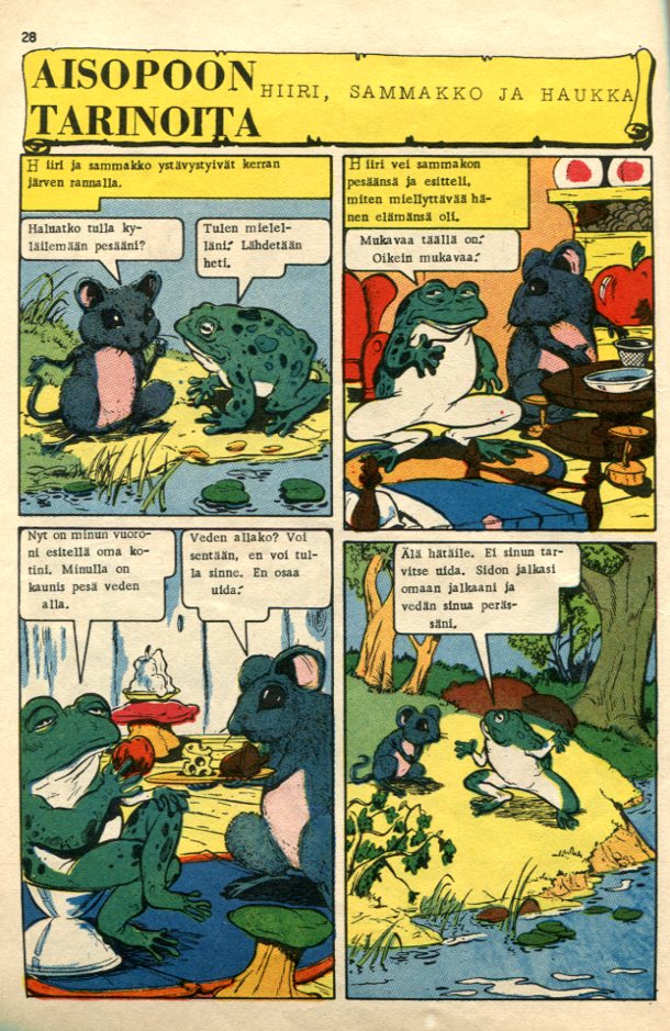 sivu 28 Aisopoon Tarinoita Hiiri, Sammakko ja Haukka Aesop's Fables The Mouse, Frog and the Hawk Piirtäjä: George Peltz