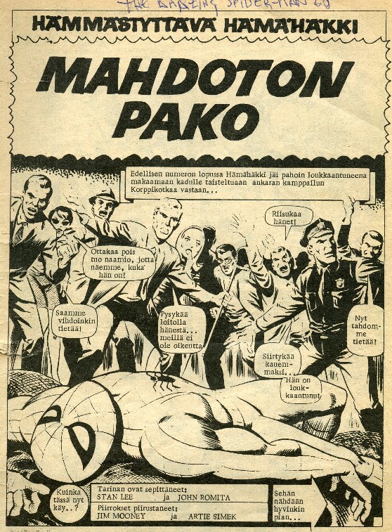 Tarina: Hämmästyttävä Hämähäkki: Mahdoton pako Sivuja: 20 Kirjoittaja: Stan Lee Piirtäjä: John Romita, Jim Mooney Tussaaja: Jim Mooney Originaali: Spider-Man: The Impossible Escape! The Amazing Spider-Man 65 (Oct 1968)