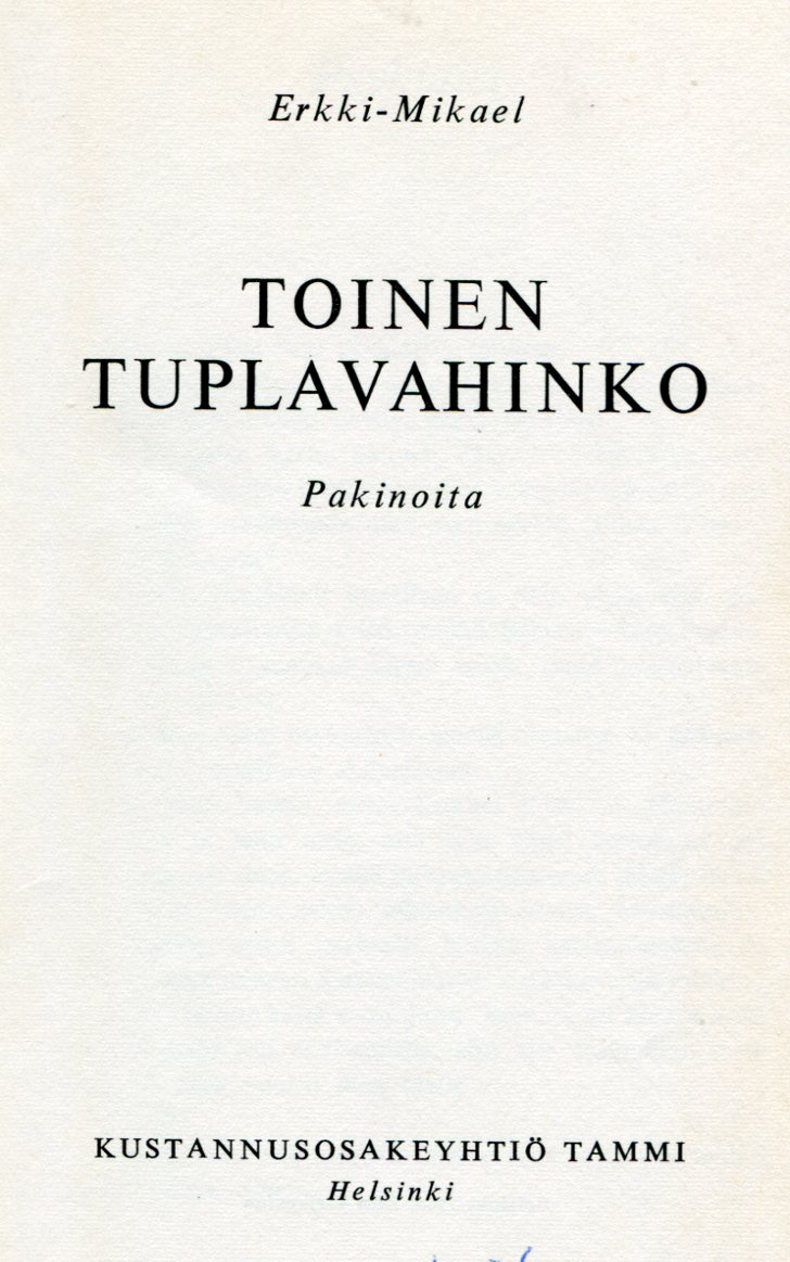 Toinen Tuplavahinko1960ensipainosNovellikokoelmaKirjailija: Erkki-MikaelKuvat: Olavi HurmerintaKustantaja: Tammi