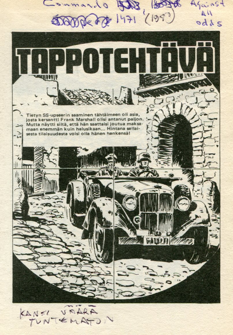 Tappotehtävä Alkuperä: Commando 1471 (1980) Against All Odds alkup nimi: Sniper! Piirtäjä: Carrion Teksti: Staff