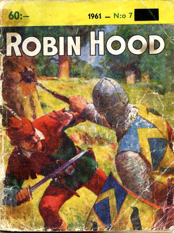 Robin Hood N:o 7 1961. Alkuperä: TPL 110 (Robin Hood, the Triumphant)(1955), TPL 118 (Robin Hood Against Norman Foes)(1956), TPL 134 (1956) ja TPL 45 (1953). Väärä Kansi: TPL 192 piirtänyt: Sep.E.Scott. Julkaistu jo numerossa 6 1958