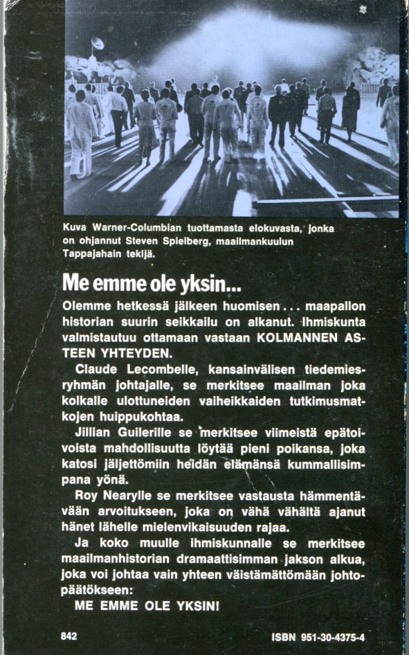 Kolmannen Asteen Yhteys1978Close Encounters of the Third Kind (1977)Tekijä: Steven SpielbergKansi: ElokuvajulisteSuomentaja: Aarne T.K.LahtinenKoko: 11,5 cm x 19 cmSivuja: 220Kustantaja: Tammi