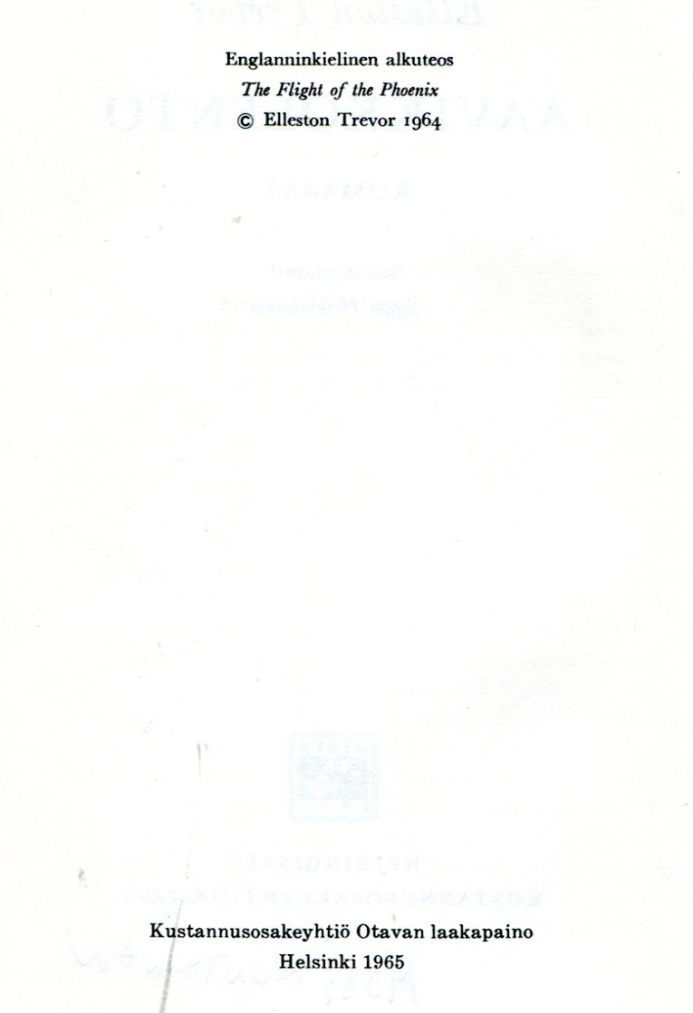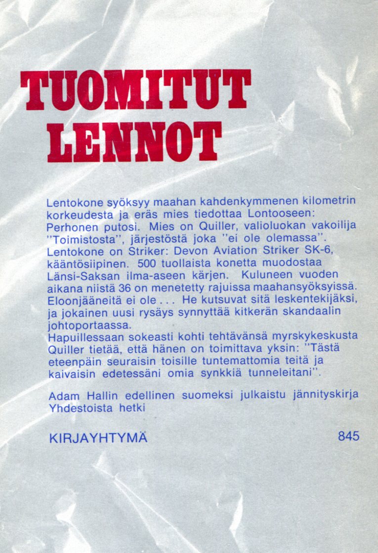 Tuomitut Lennot1969The Striker Portfolio (1968)Kirjailija: Elleston TrevorKansi: Ismo KajanderSuomentaja: Erkki Ihanainenkoko: 14,5 cm x 21 cmsivuja: 232kustantaja: Kirjayhtymä