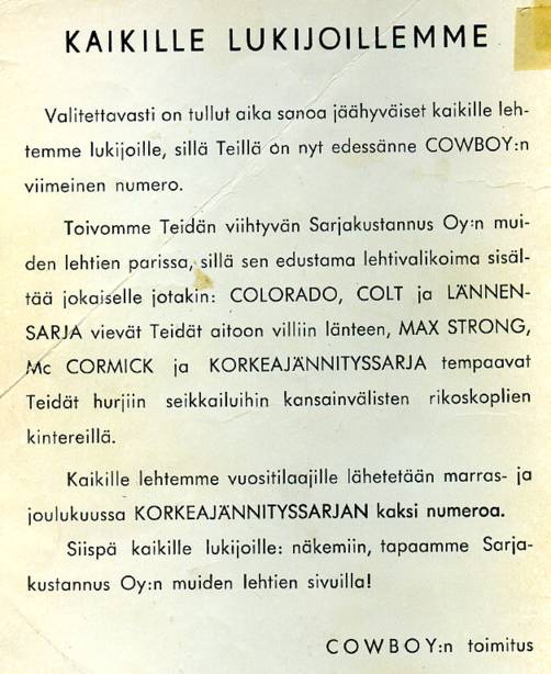 Cowboy 10 1963Kansi: Jordi PenalvaPuolustajatSankarit: Gun Tamers - Kesyttäjät64 sivuaCowboy Picture Library 432 (1961)The DefendersPiirtäjä: Carlos V.RoumeTämä oli vihonviimeinen Cowboy-lehti.