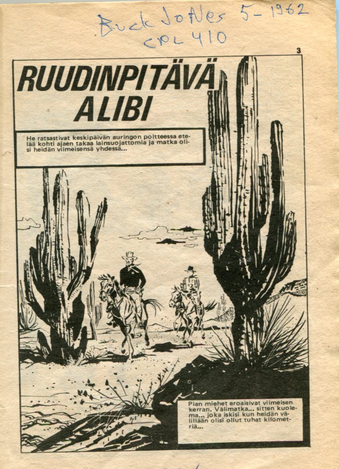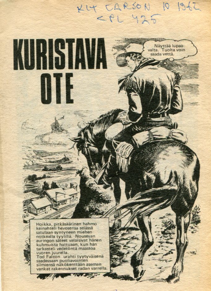 Kuristava Ote Starring: Tod Falcon (alunperin Kit Carson) Alkuperä: Cowboy Picture Library 425 (1961) Gun Trail Piirtäjä: Luis Dominguez