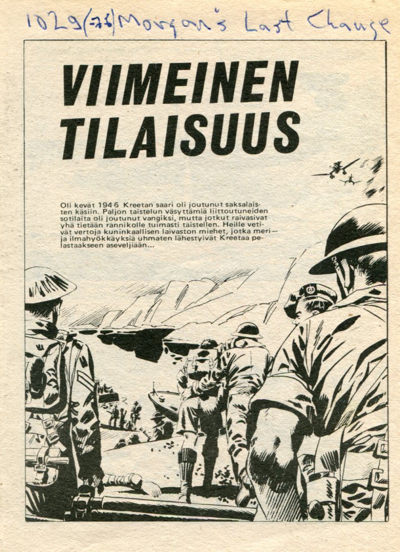 Merten Korkeajännitys 11977sivu 3Kansi: Viimeinen TilaisuusKannen piirtäjä: Ian KennedyViimeinen TilaisuusAlkuperä: Commando 1029 (1976)Morgan's Last ChangePiirtäjä: FerreiraTeksti: Daniel