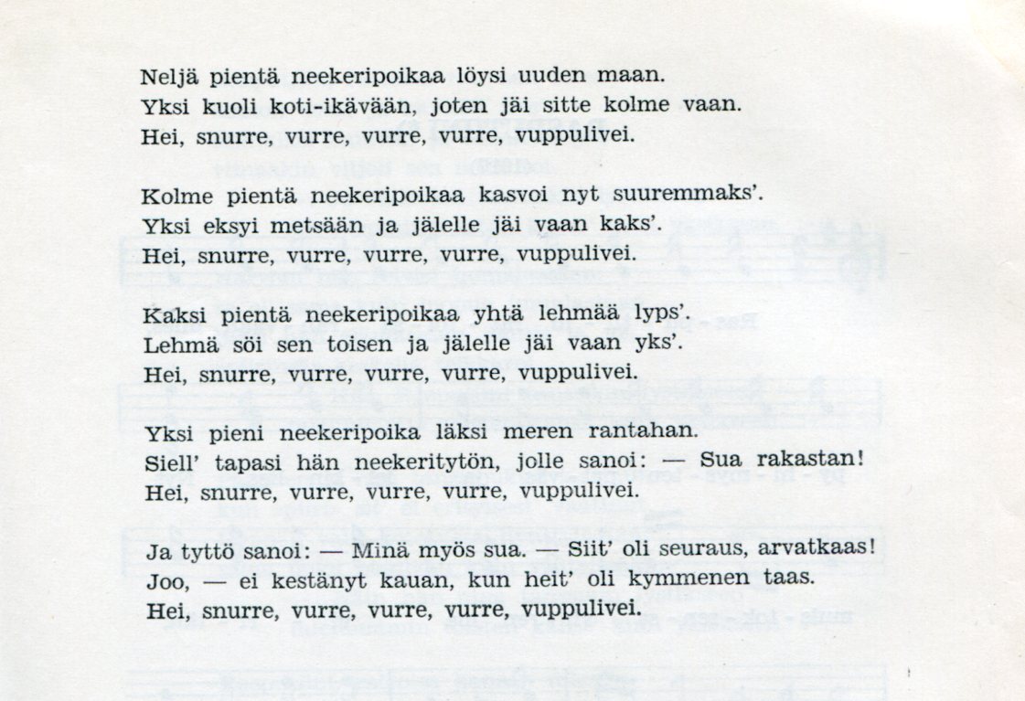 Eikä Yksikään Pelastunut1940ensipainosTen Little Niggers (1939)Kirjailija: Agatha ChristieSuomentaja: Helka VarhoKansi: Eeli JaatinenSarja: 10 mkKustantaja: WSOY