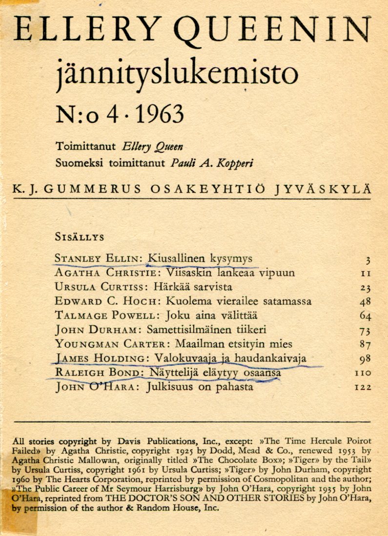 Ellery Queenin Jännityslukemisto 41963Ellery Queen's Mystery MagazineEllery Queenin valitsema novellikokoelmaUseita kirjailijoitaKansi: Matti LouhiKustantaja: Gummerus Oy