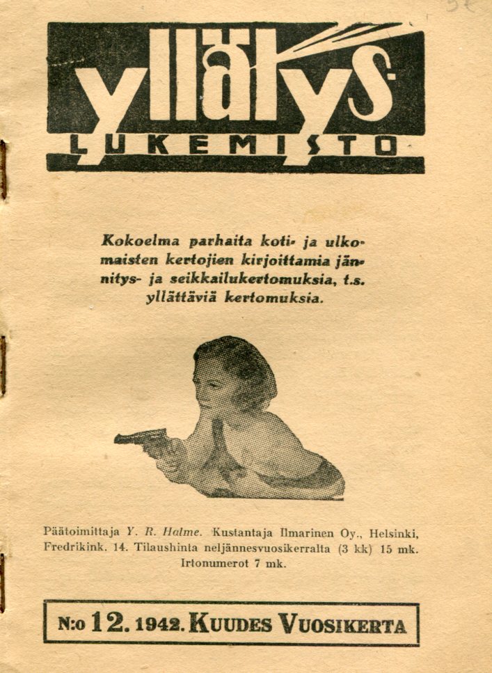 Yllätyslukemisto 121942Kannet: 2-väristä kartonkia (vai 1-väristä?)Kannen piirtäjä: Ami HauhioJännityslukemistokoko: 13 cm x 18 cmsivuja: 80Kustantaja: Ilmarinen Oy