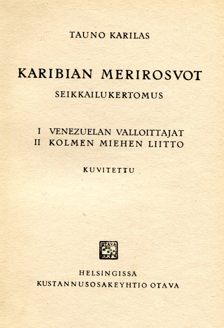 Kirjasarja Seikkailujen MaailmaKaribian Merirosvot1951sivu 37toinen painosKirjailija: Tauno KarilasKuvitus: Aarne NopsanenKustantaja: Otava