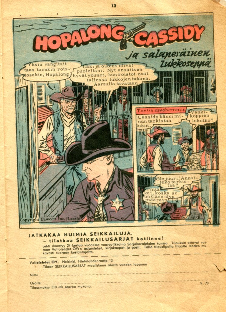 Seikkailusarjat 4 1953Kansi: Hopalong CassidyHopalong Cassidy 71 (sep 1952)(värjätty mustavalkokuva)1 Kultanuolija Intiaanien Kapina (7 sivua)2 Käppyräja Villikissa (4 sivua)3 Hopalong Cassidyja Salaperäinen Lukkoseppä (7 sivua)Hopalong CassidyThe Case of the Mysterious LocksmithHopalong Cassidy 71 (sep 1952)Piirtäjä: Joe CertaTakakansi: Uusien Autojen ParaatiFord Taunus 12 M