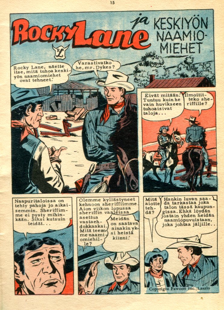 3 Rocky Lane ja Keskiyön Naamiomiehet (5 sivua) Rocky Lane The Midnight Marauders Rocky Lane Western 47 (mar 1953) Piirtäjä: John Forte (?)