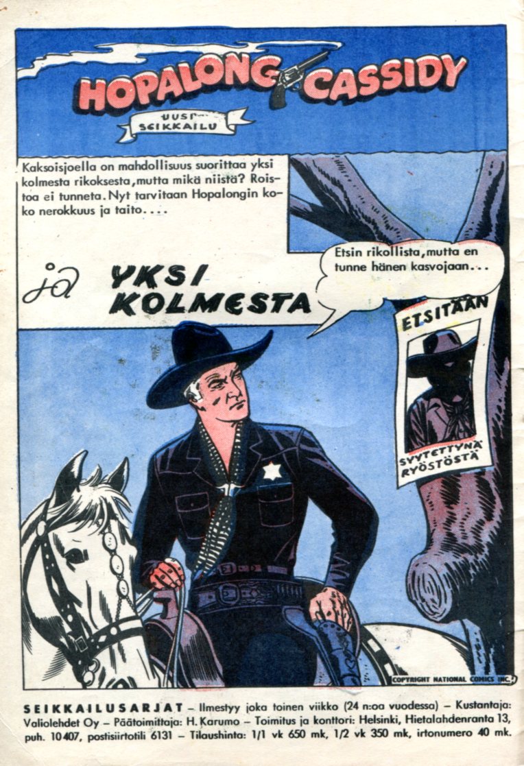 1 Hopalong Cassidy ja Yksi Kolmesta (8 sivua) Hopalong Cassidy Sheriff Cassidy's Mystery Clue Hopalong Cassidy 111 (mar 1956) Piirtäjä: Gene Colan Teksti: Edward France Herron