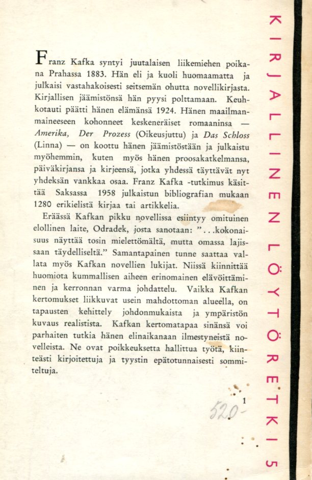 Novellikokoelma Erzählungen und Kleine Prosa (1946) ja Beschreibung Eines Kampfes (1946) Kirjailija: Franz Kafka Kansi: Martti Mykkänen Pehmeät kartonkikannet Kääntäjät: Aarne Peromies Kristiina Kivivuori Eeva-Liisa Manner koko: 12,8 cm x 20,4 cm sivuja: 238 Sarja: Kirjallinen Löytöretki 5 Kustantaja: Gummerus