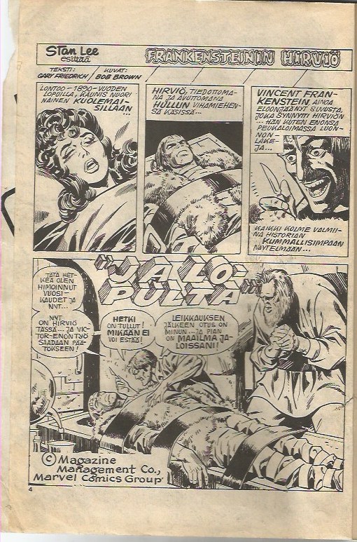 Ihmissusi ja Frankenstein 51974sivu 4:... Ja LopultaFrankenstein Monster 11 (jul 1974)Alkuperäinen KansiPiirtäjä: John RomitaKustantaja: SemicSkannattu Petri Aarnion Kokoelmista