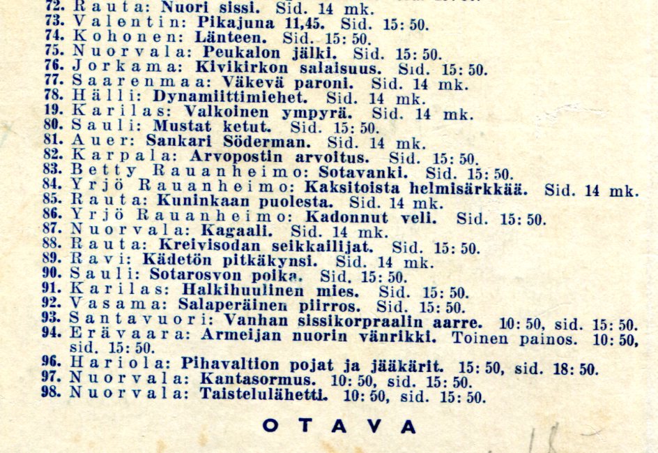Poikien Seikkailukirjasto 961 Laitos1941Pihavaltion Pojat ja JääkäritKirjailija: H.HariolaKansi: Eila KaustiaKustantaja: OtavaKirja on julkaistu myös toisessa laitoksessa.