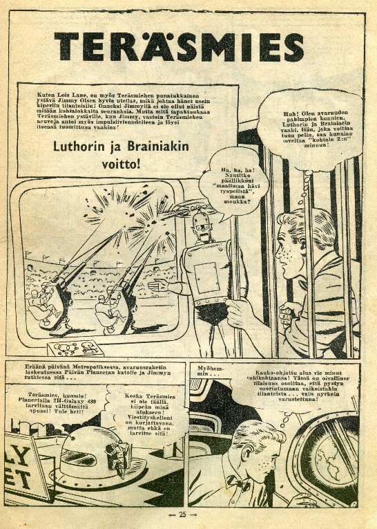 TERÄSMIES 2/1965Sivu 25Tarina: Teräsmies:Luthorin ja Brainiacin voittoSivuja: 8 s.Kirjoittaja: Jerry SiegelPiirtäjä: John ForteTussaaja: John ForteOriginaali: Superman:The Triumph of Luthor and BrainiacSuperman 173 (Nov 1964)