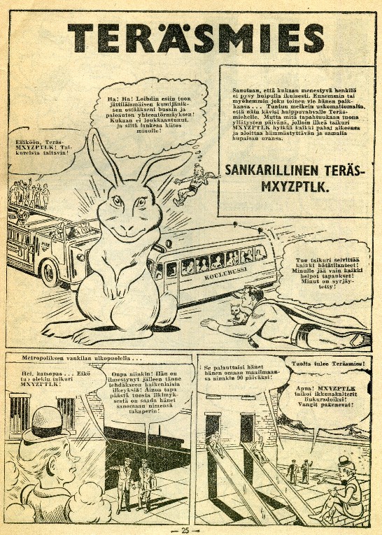 Tarina: Teräsmies: Sankarillinen Teräs-MXYZPTLK Sivuja: 8 s. Kirjoittaja: Jerry Siegel Piirtäjä: Al Plastino Tussaaja: Al Plastino Originaali: Superman: Super-Mxyzptlk, Hero Superman 174 (Jan 1965)